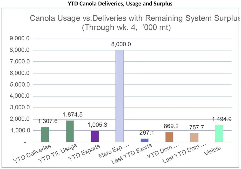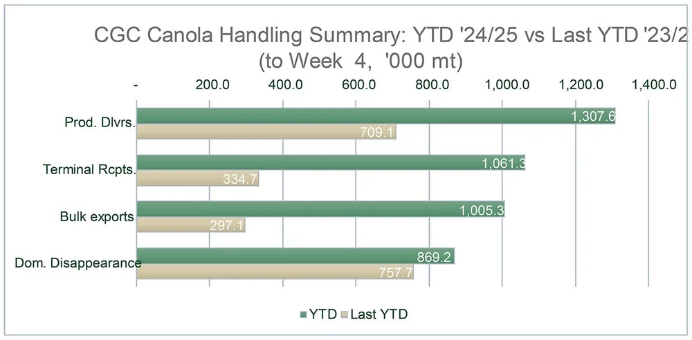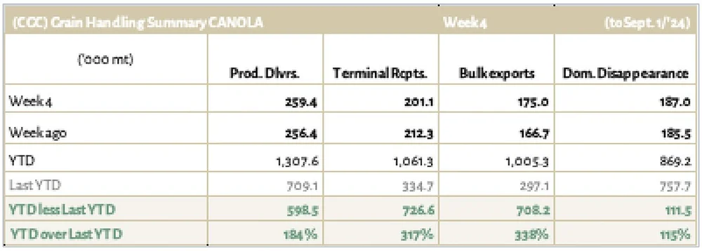 Canola: YTD total canola disappearance into week 4 of the crop year amounts to 1.9 million MT compared to 1 million MT last year and is up 78% on last year.