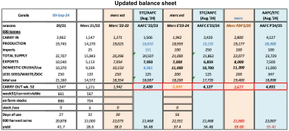 [Note we also updated the AAFC numbers (blue background columns) using the latest StatsCan production number (including the revised numbers for ‘21, ’22, ’23), but they make no sense and are not useful.]