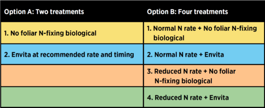The two main treatments compared crop growth and productivity with and without an application of a biological product under a normal operational rate of applied nitrogen (N) fertilizer. Two optional treatments further compared the performance of the product with a reduced rate of applied N fertilizer. The decision to include two or four treatments were dependent on each cooperator’s objective for conducting this trial.