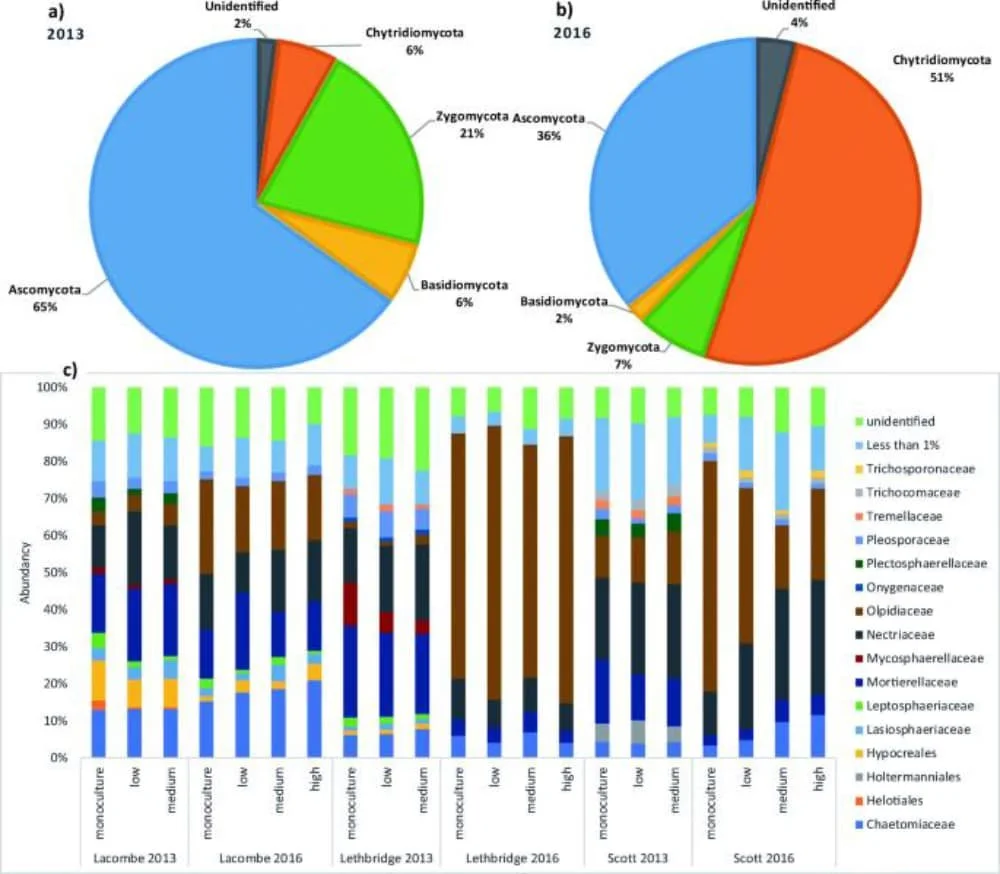 Variation in taxonomic profiles (of fungal microbiome of the canola rhizosphere) is characterized by an increase in the abundance of the Olpidiaeae in the phylum Chytridiomycota in 2016. Fungal families also varied with site, crop diversification level, and year (c).