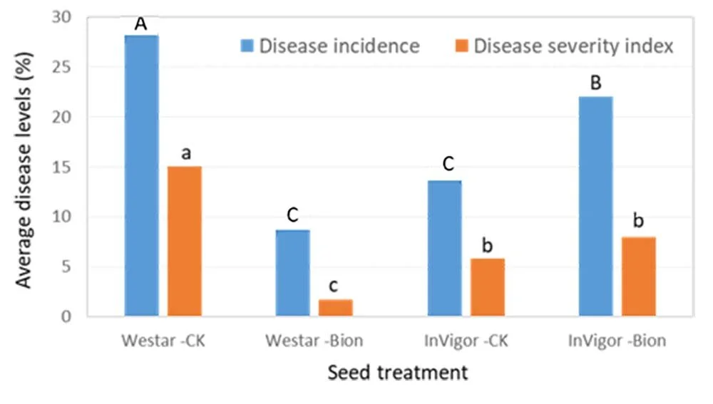 Figure 3. Effect of Bion seed treatment on disease incidence and disease severity index of blackleg originating from cotyledon inoculation on Westar (susceptible) and InVigor (resistant) in two 2021 field trials near Saskatoon, SK and Brandon, MB, respectively. Treatment means with the same letter and case do not differ (LSD, P >0.05).