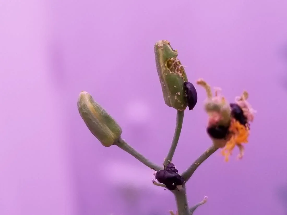 To determine the economic threshold the trials was conducted within field cages to eliminate the influence of other insects pests on yield, wild bees were placed in the cage for pollination. Plant samples were also collected from outside the cages to compare the influence of other pests on yield. Noronha’s research team also conducted sweep net sampling, a common method used for sampling canola to determine population levels in 2021 and related it to damage.