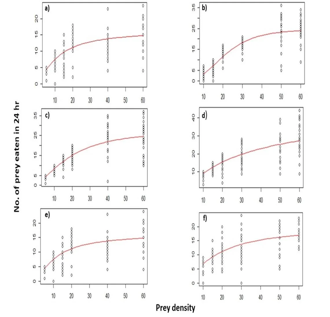 Functional response curves of generalist predator species consuming life stages of DBM a) C. carnea on DBM eggs, b) C. carnea on DBM larvae, c) P. melanarius on DBM eggs d) P. melanarius on DBM larvae e) Nabis spp. on DBM eggs f) Nabis spp. on DBM larvae.