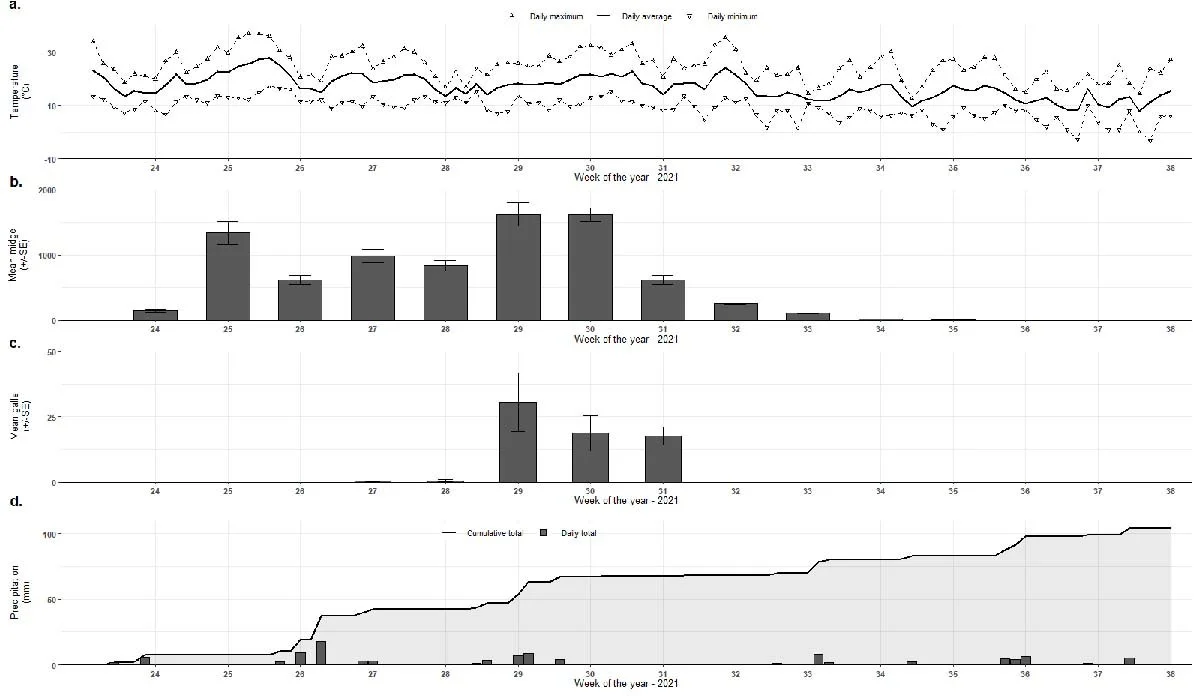 Figure 1: Comparison of environmental conditions and canola flower midge activity during the 2021 growing season. Measurements of daily air temperature and precipitation in figures (a.) and (d.) were collected from a monitoring station < 2 km from the nearest field location. Figures (b.) and (c.) respectively indicate the mean weekly counts of male canola flower midge (captured by two pheromone-baited Jackson traps) and infested canola flower buds (from 25 plant samples) between twelve sampling locations (± SE).