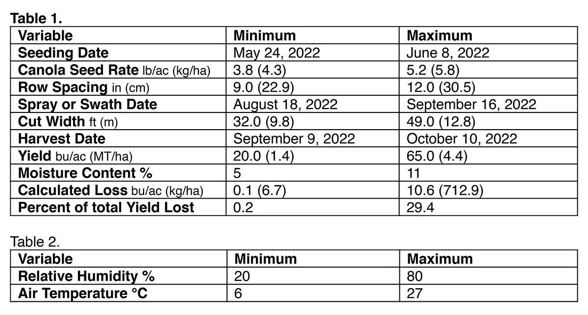 - Average daily temperature had a significant effect on canola harvest yield loss while the overall range of temperature and humidity throughout the day did not appear to.