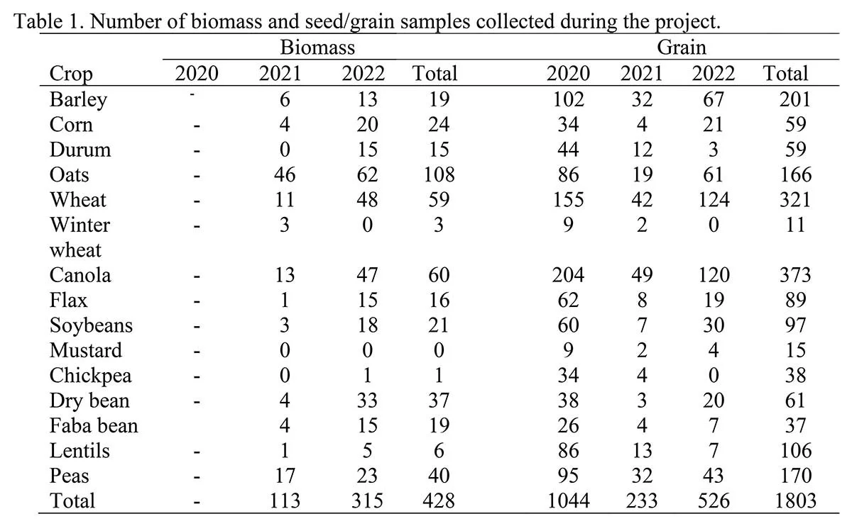 The 14 crops studied included barley, corn, durum, oats, spring wheat, winter wheat, canola, flax, soybean, mustard, chickpea, dry bean, lentil, and field pea. Faba bean was added because samples were available and seeded acres had increased. The original goal was to collect 100 grain/seed samples of each of the 14 crops in each of the two years, with the actual number of samples collected in each province reflecting the seeded acres. In response to the 2021 drought, the biomass sample collection was reduced to 20% of what had been planned, leaving the remaining 80% of samples to be collected in 2022 (Table 1). Both grain and biomass samples were analyzed for nutrient content. Moisture content was also adjusted to the recommended threshold set by the Canadian Grain Commission.