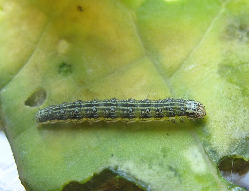 The beet webworm, Loxostege sticticalis (Linnaeus), is a slim, active, dark-green caterpillar which eats leaves, flowers and patches of bark from flax stems and branches. Localized areas can suffer severe damage. Determine if a significant number of bolls are being damaged before applying control.