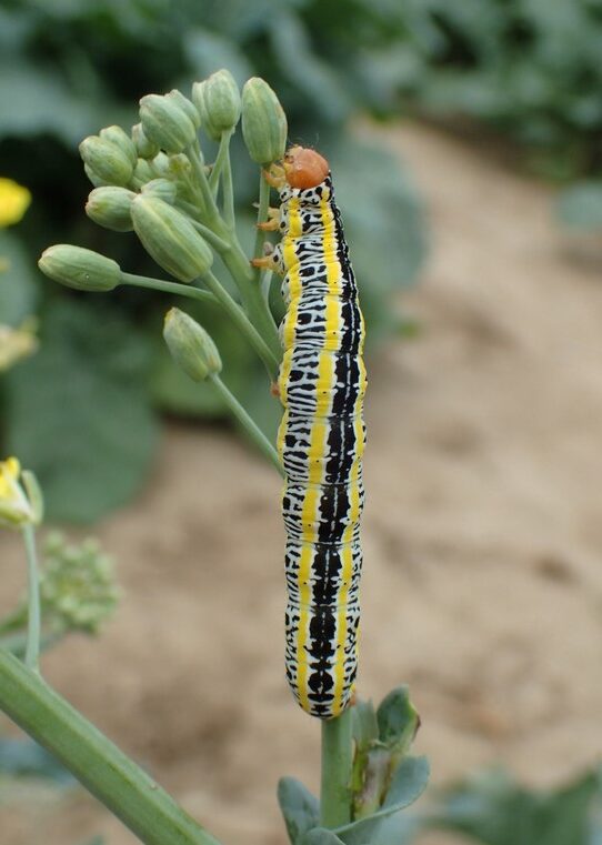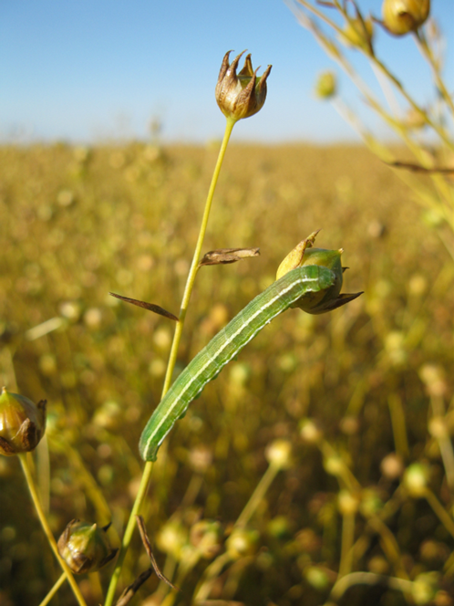 The bertha armyworm, Mamestra configurata (Walker), was a regular pest of flax before canola and mustard were grown on the Prairies. However, since the widespread introduction of the Brassica crops, the bertha armyworm rarely causes economic damage to weed-free flax fields. If bertha-armyworm-infested canola fields are swathed and green flax fields are nearby, the flax can then suffer significant damage from invading larvae. When abundant, bertha armyworms cause serious damage by chewing through the stems below the bolls causing them to drop to the ground.