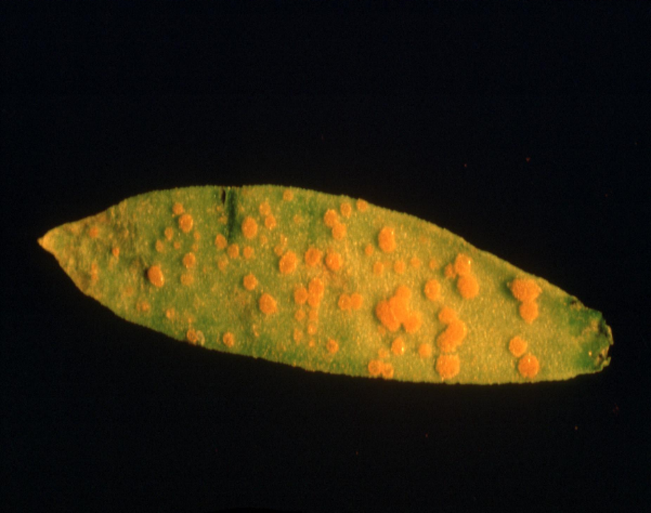 Rust is readily recognized by the presence of bright orange and powdery pustules, also called uredia. Rust pustules develop on leaves, stems and bolls but mostly on the underside of the leaves. The pustules produce numerous urediospores which are airborne and cause new cycles of infections during the season. Spread and infections are favoured by high humidity during cool nights, warmer day temperatures, and vigorous plant growth. As the season progresses, the orange pustules turn black and produce overwintering teliospores. The black pustules are most common on stems.